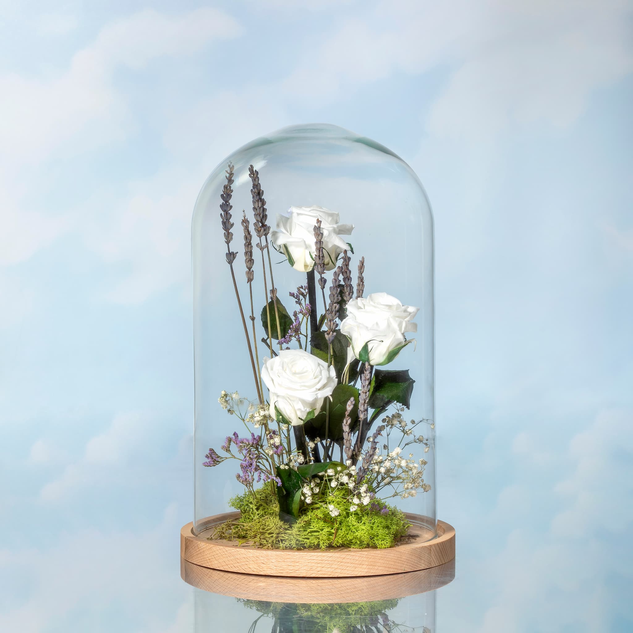 Cúpula de cristal con rosa preservada en color blanco, con musgo preservado y decoración natural. Un regalo original y elegante que permanecerá inalterable durante muchísimo tiempo.