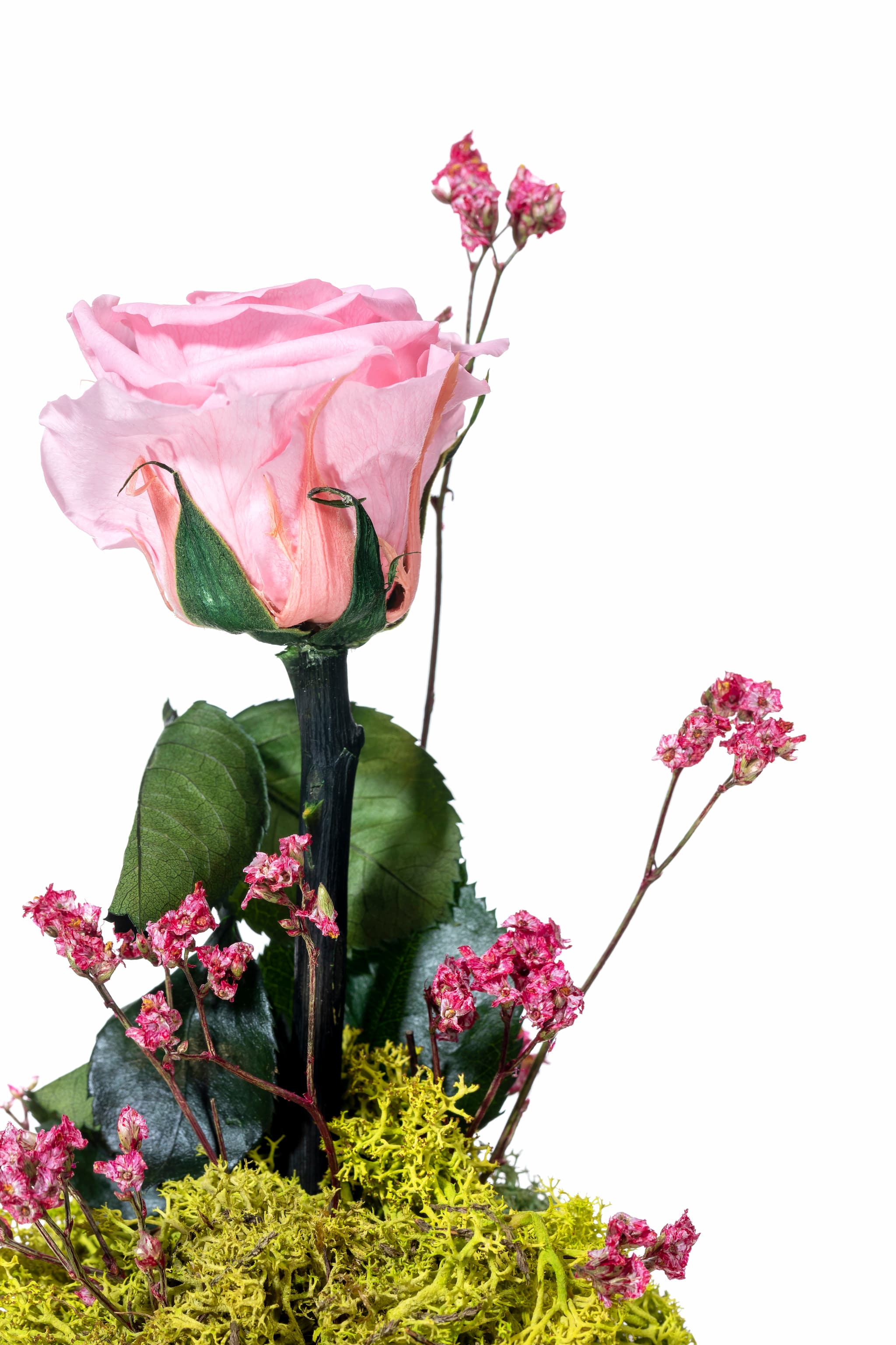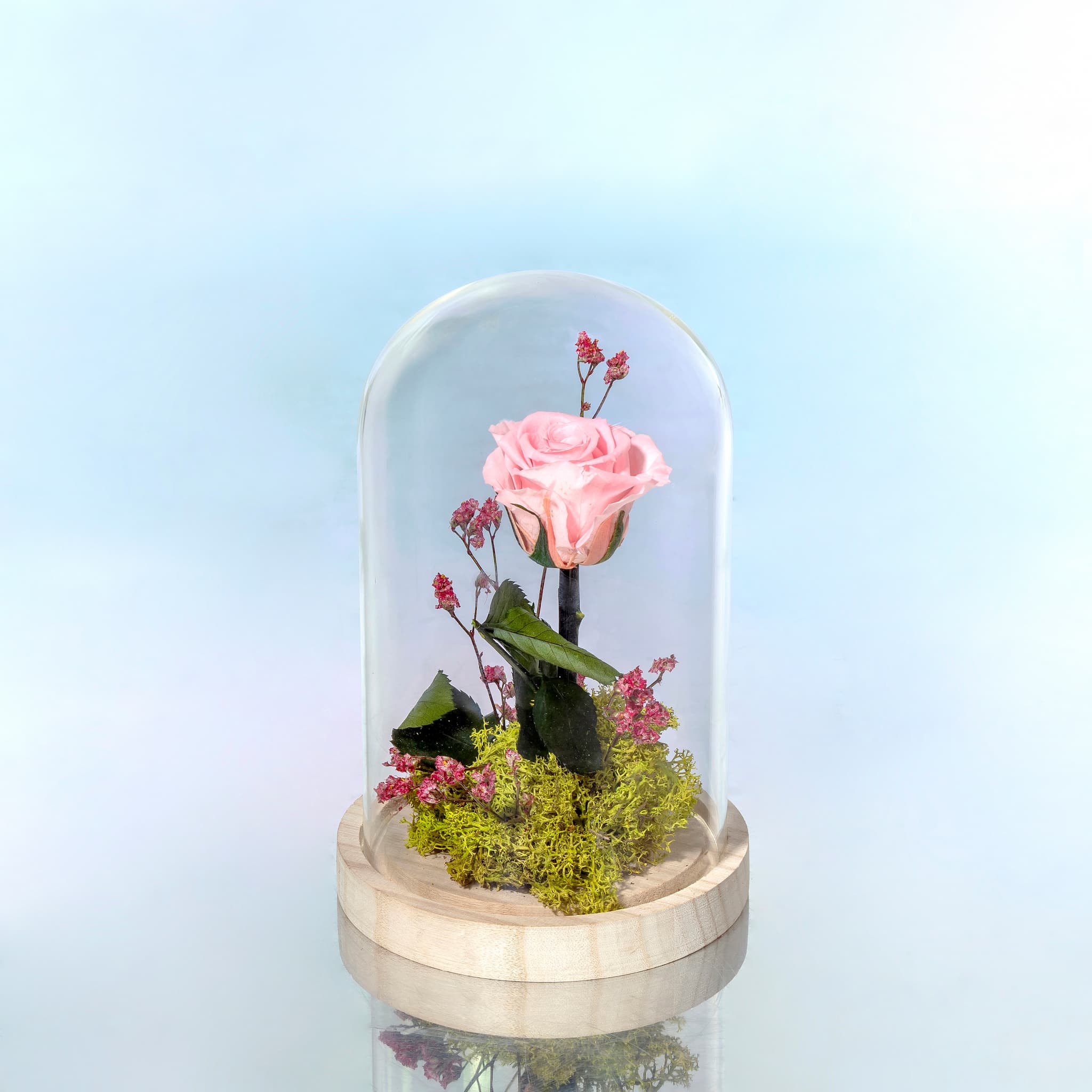 Cúpula de cristal con rosa preservada en color rosa, con musgo preservado y decoración natural. Un regalo original y elegante que permanecerá inalterable durante muchísimo tiempo.