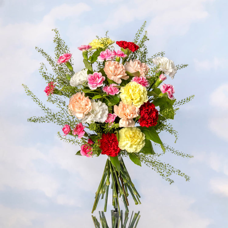 Este divertido arreglo floral, ofrece una combinación única de claveles y clavellinas de distintos colores, como rojo, blanco, amarillo, rosa y melocotón, proporcionando una explosión de alegría y vitalidad.