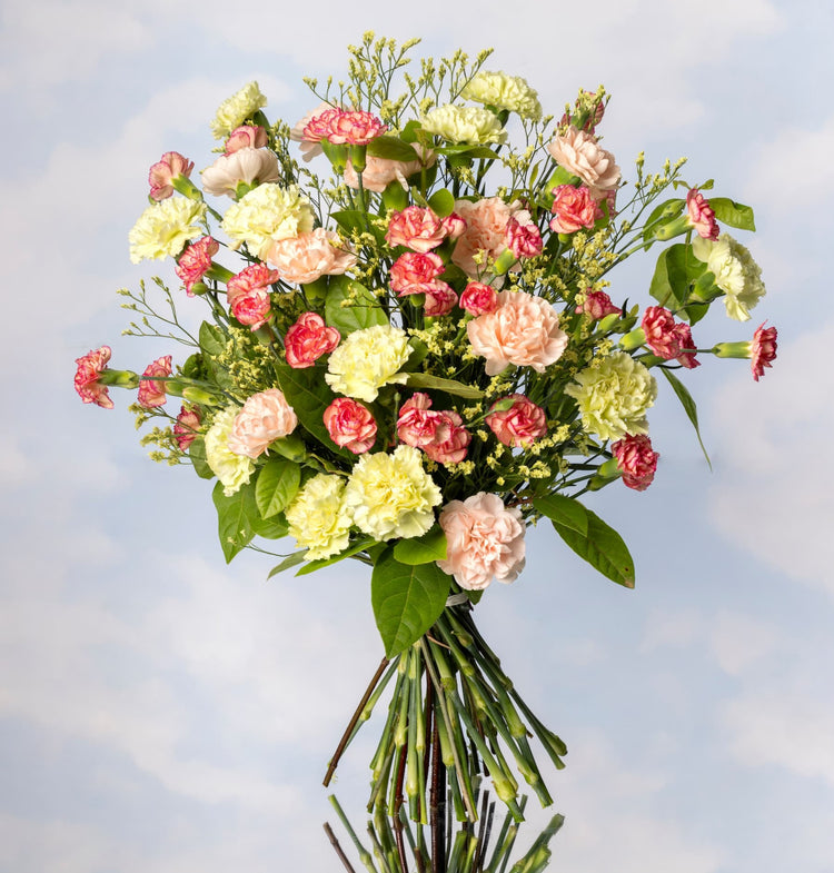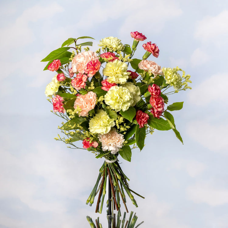 Los suaves tonos melocotón y verde de los claveles se mezclan armoniosamente con el brillo alegre de las clavellinas naranjas, creando una combinación visualmente impactante y llena de energía positiva.