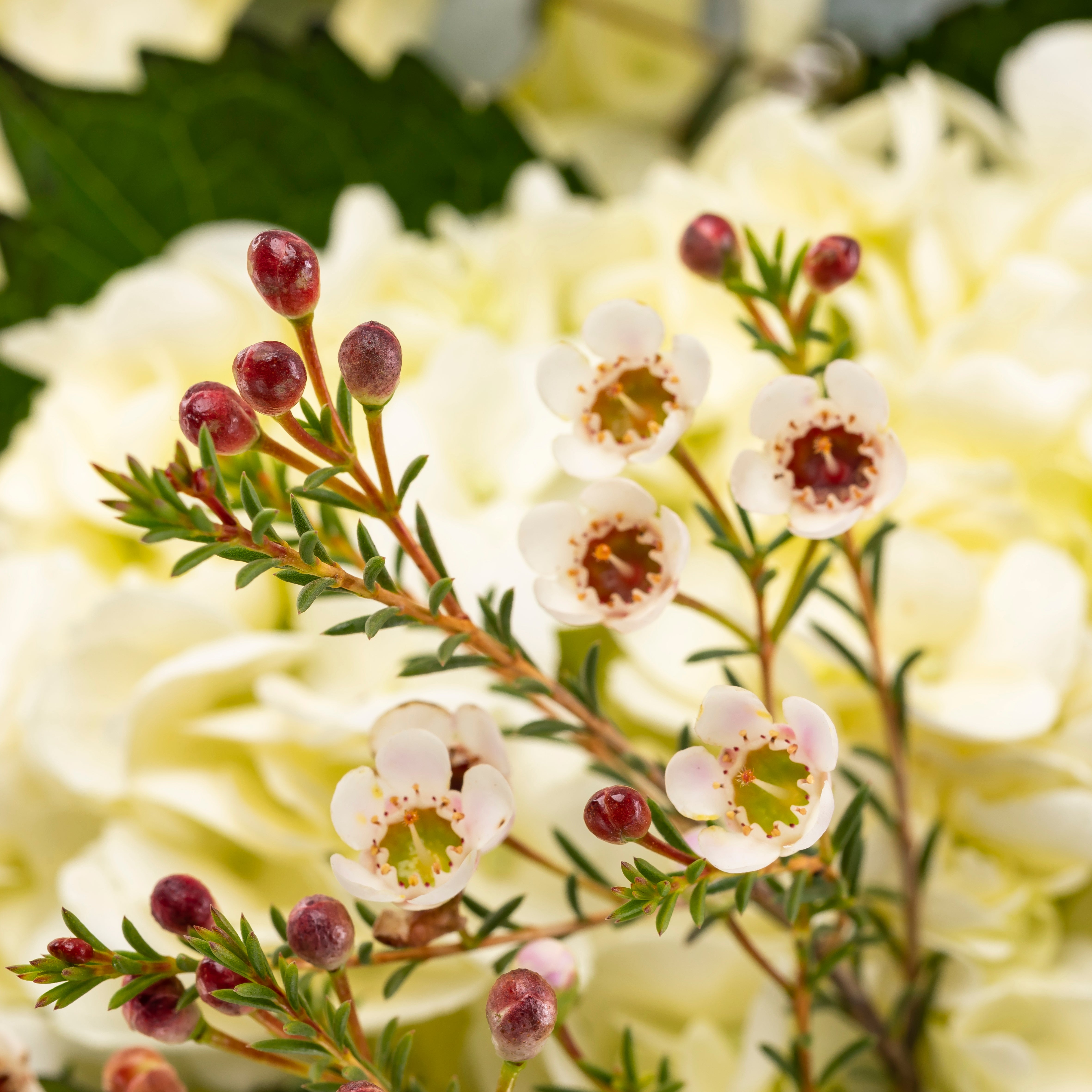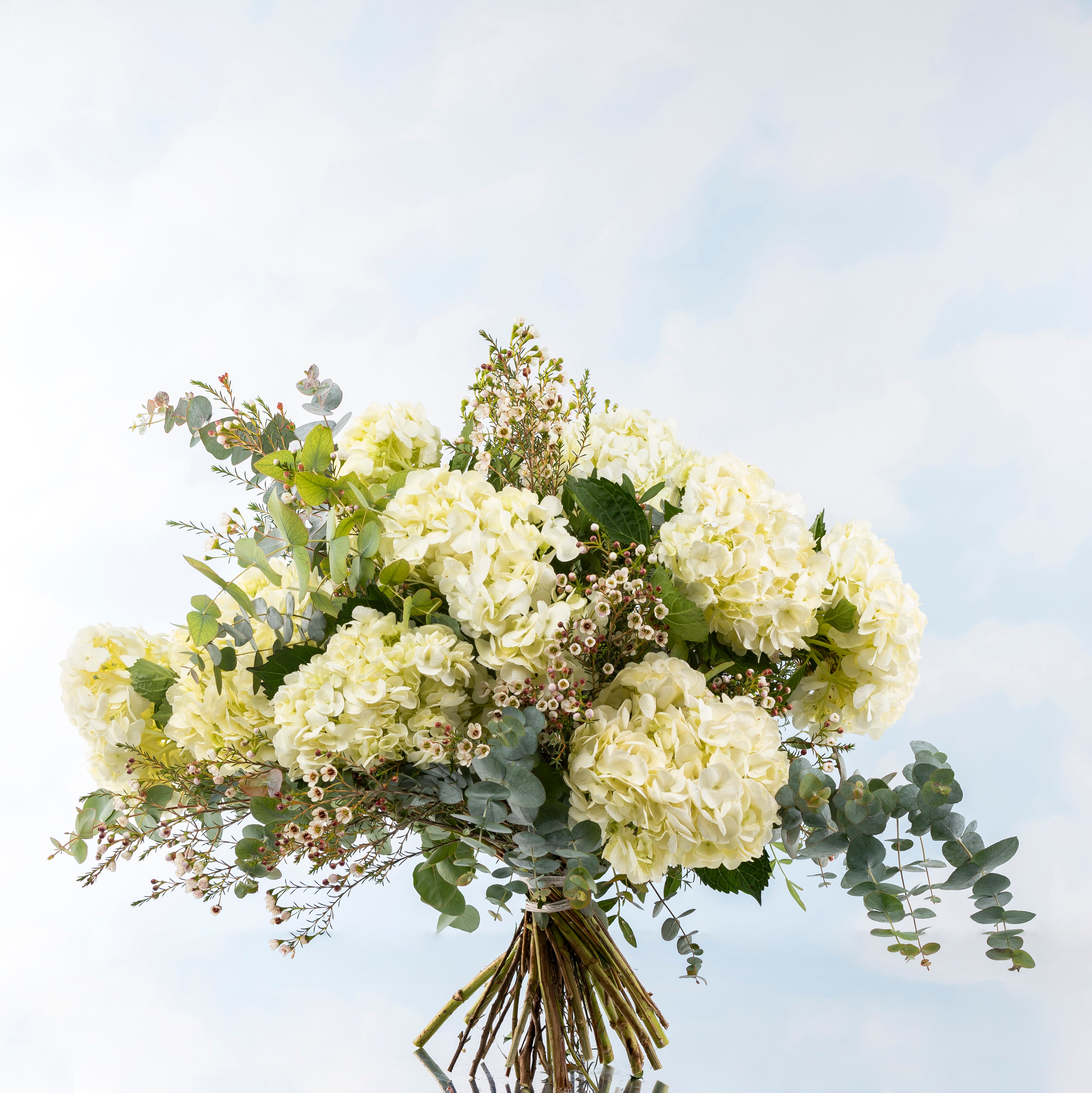 Ramo compuesto de HORTENSIAS BLANCAS que se entremezclan con flores silvestres y el verde del eucalipto para conseguir un ramo elegante y cómodo que será perfecto para regalar en cualquier ocasión o simplemente para decorar algún rincón de tu casa. Las HORTENSIAS BLANCAS son todo un espectáculo y es imposible no caer rendido ante tanta belleza. Siempre elaborado con las flores más frescas para asegurar la máxima duración de nuestros ramos. Preparado, envuelto y asegurado por nuestros expertos floristas para que no sufran desperfectos durante el transporte.