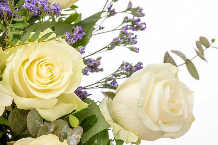 Las Rosas símbolo de pureza y majestuosidad, se combinan armoniosamente con las ramas de Eucalipto, aportando un toque de romanticismo y frescura.