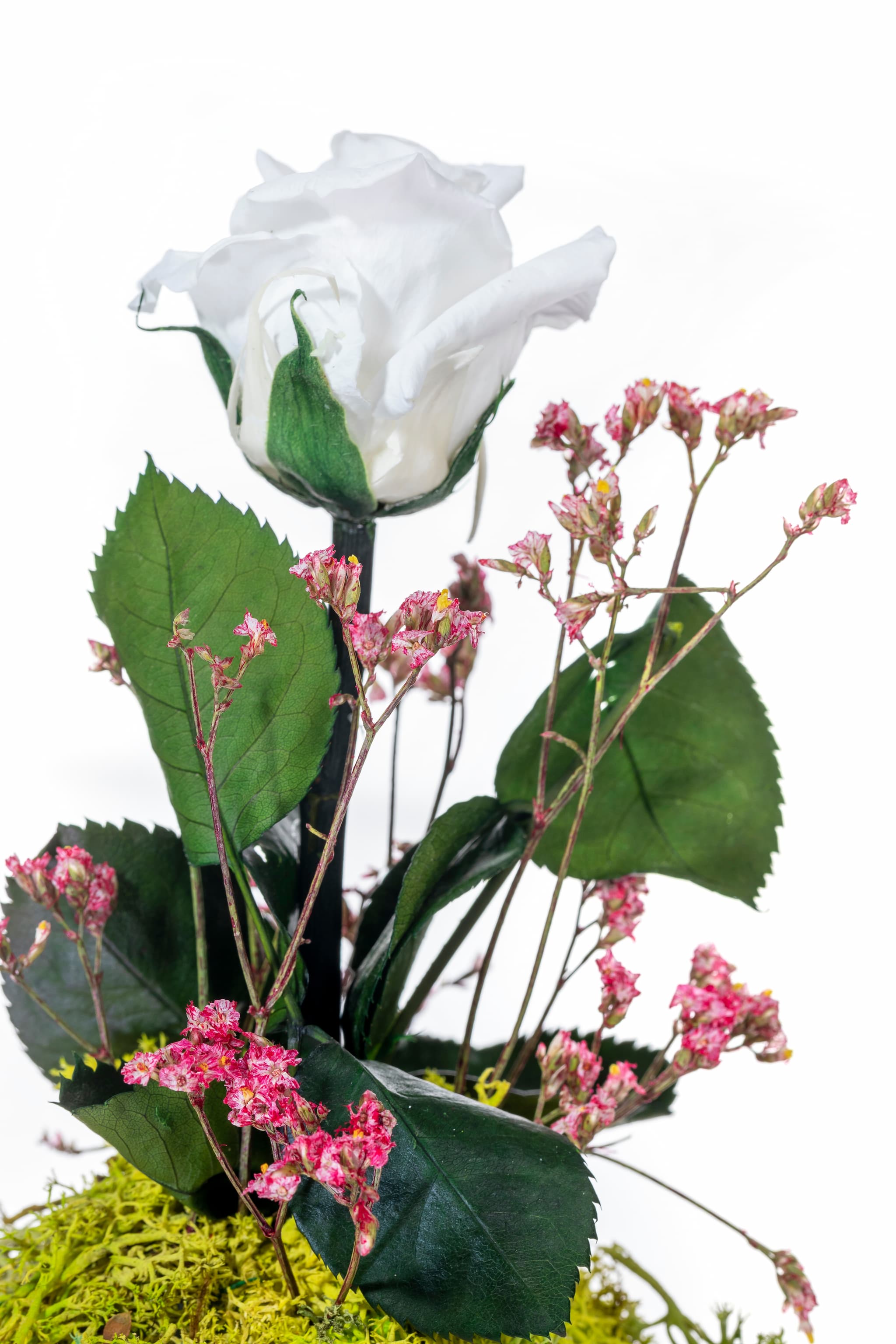 Cúpula de cristal con rosa preservada en color blanco, con musgo preservado y decoración natural. Un regalo original y elegante que permanecerá inalterable durante muchísimo tiempo.