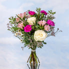 Descubre la frescura y vitalidad del ramo Luz Rosada, una composición llena de energía que combina tonos rosados y verdes vibrantes, evocando la ilusión del despertar previo a la primavera.