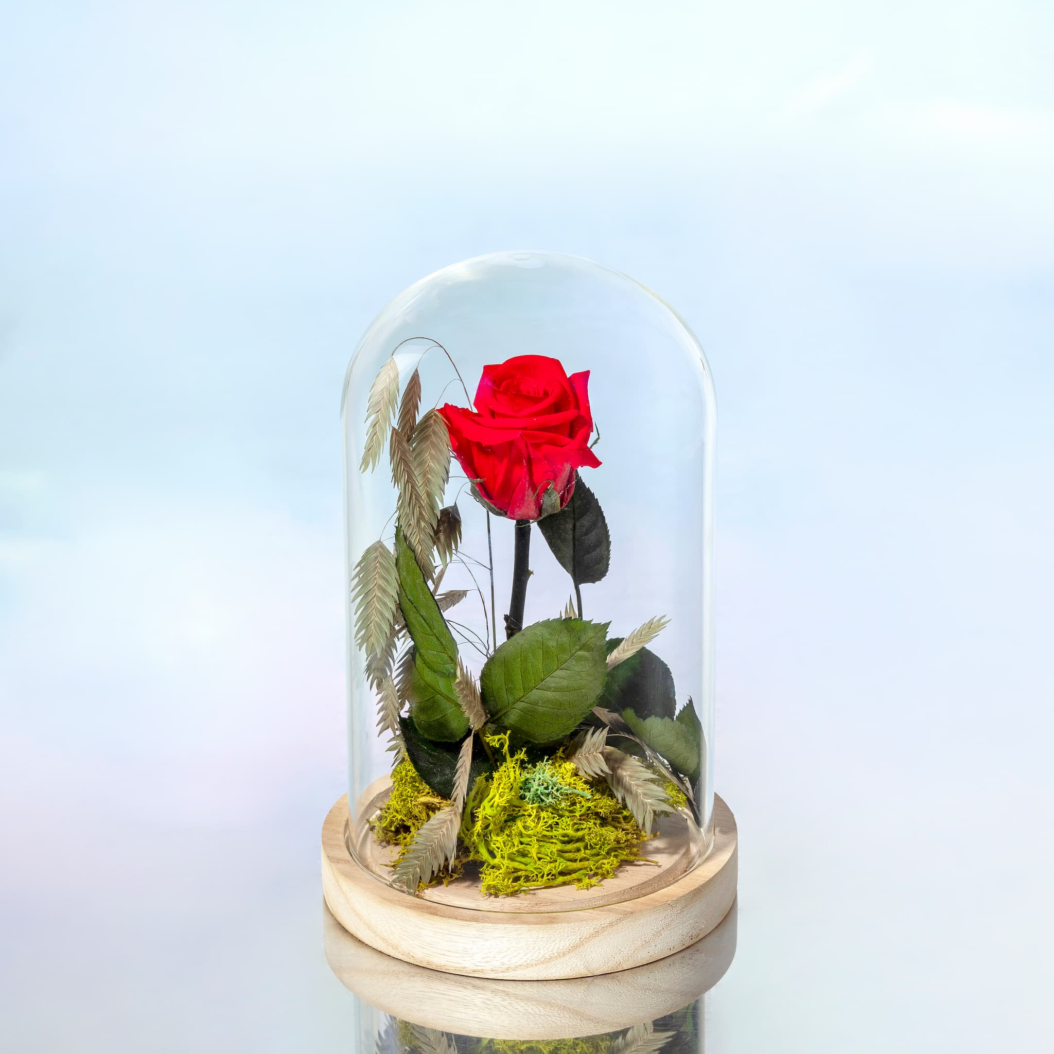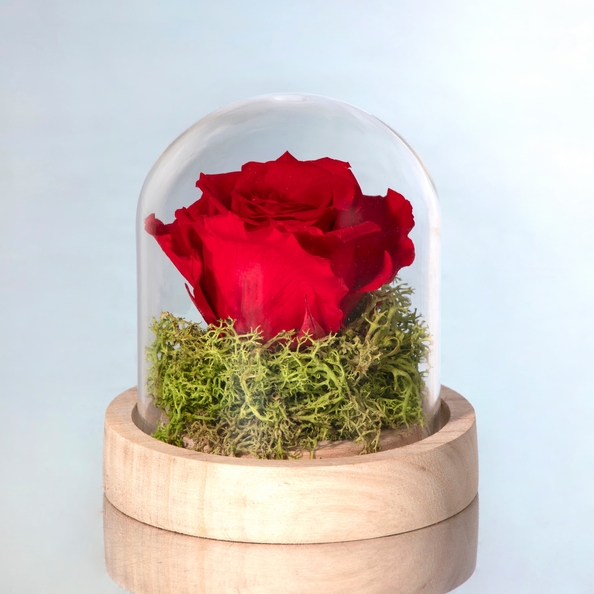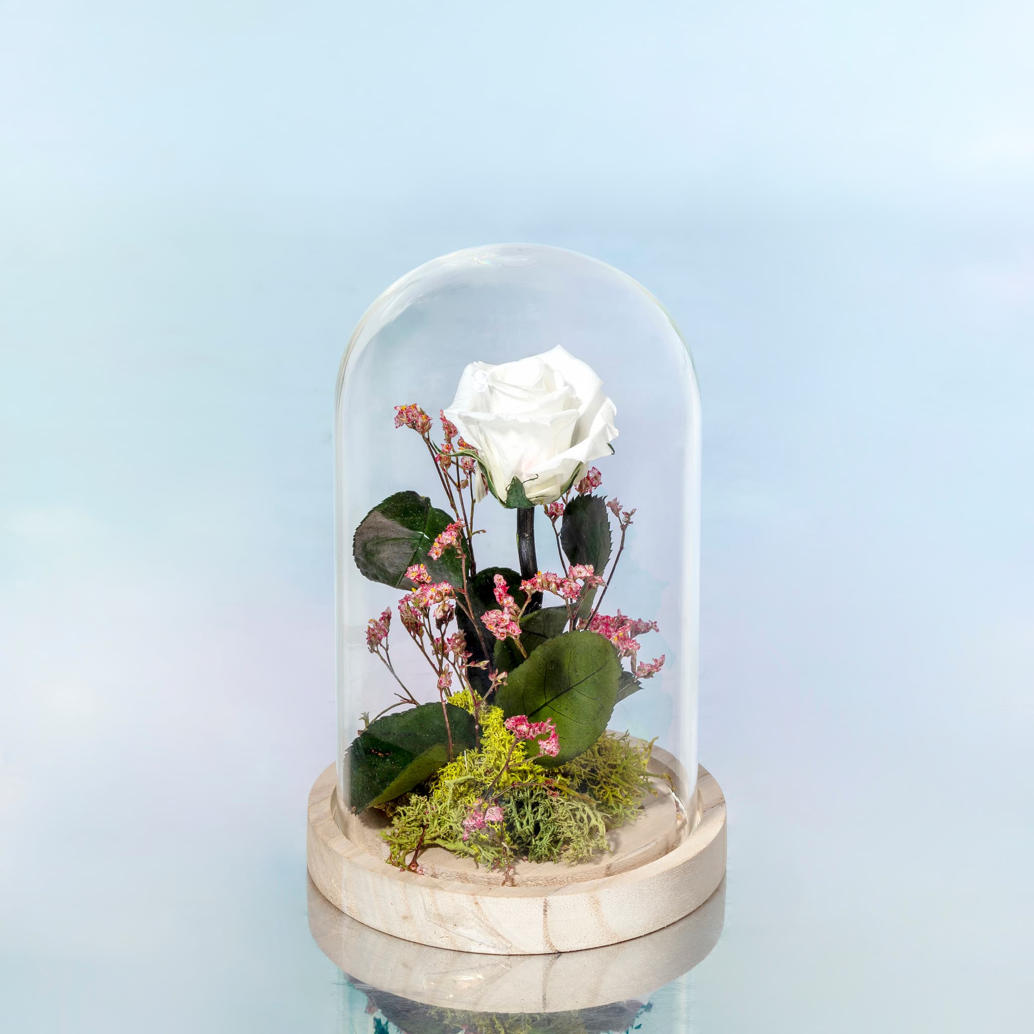Flores preservadas presentadas en una cúpula de cristal. Perfectas para decorar cualquier ocasión especial o para hacer un regalo.