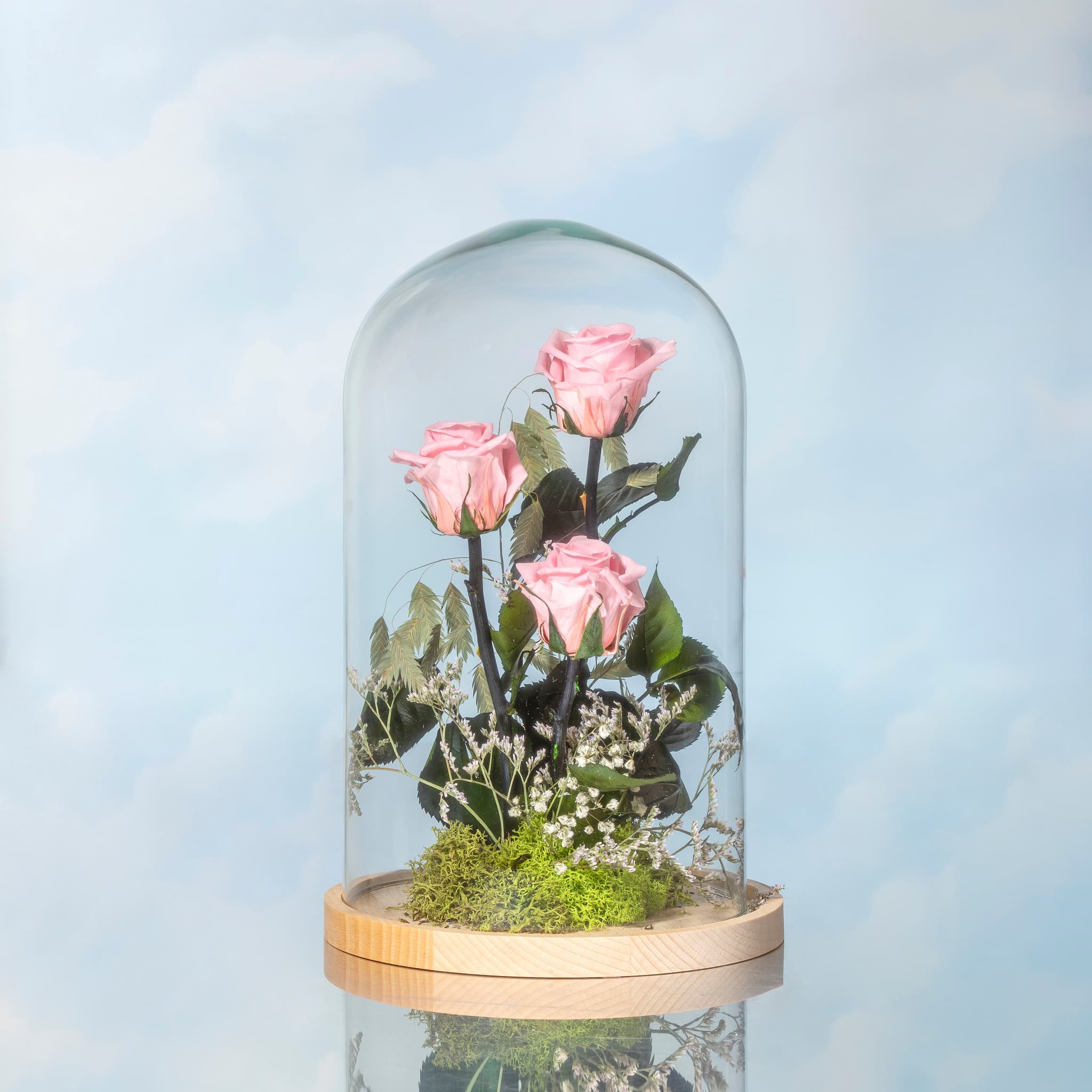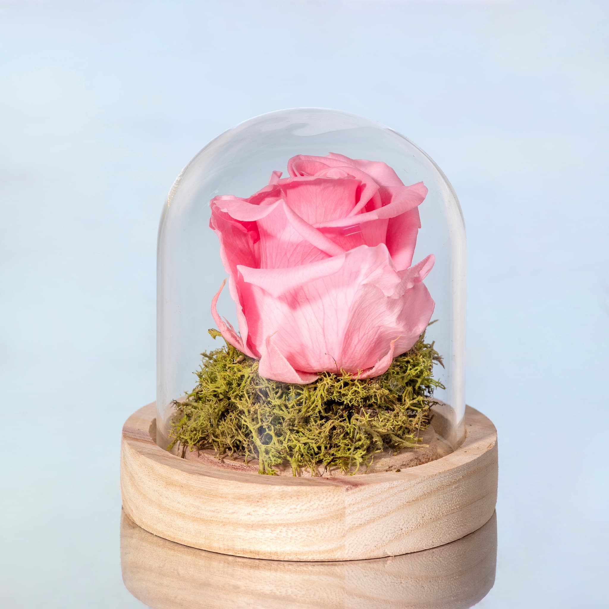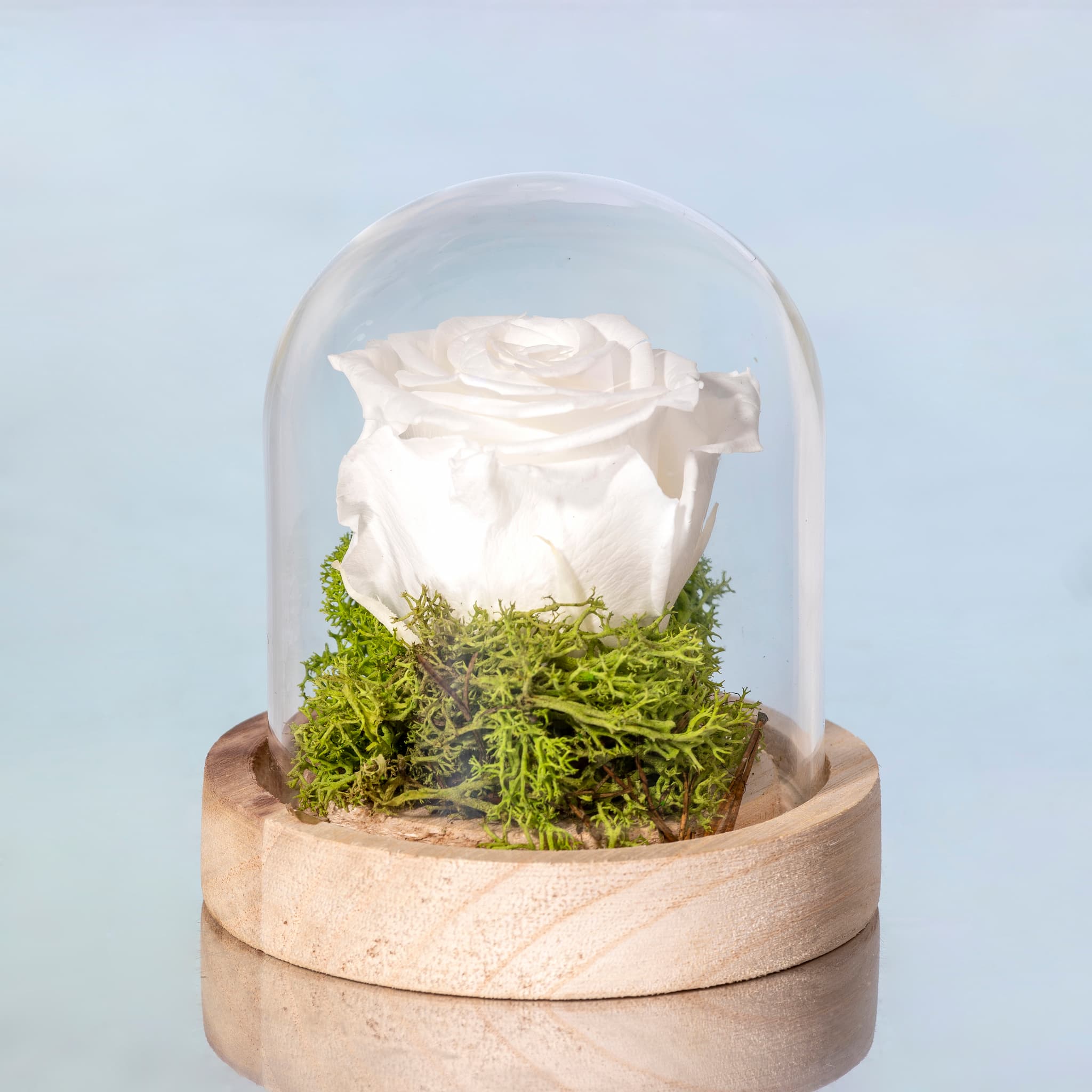 Flores preservadas presentadas en una cúpula de cristal. Perfectas para decorar cualquier ocasión especial o para hacer un regalo.