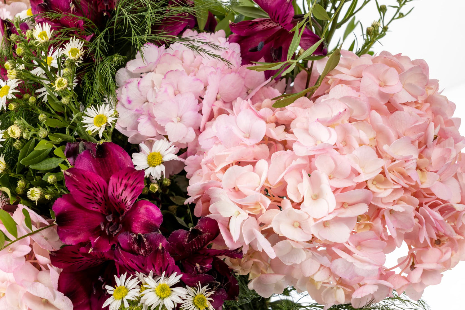 Ramo compuesto de hortensias rosadas y flores silvestres que se mezclan con el verde del eucalipto para conseguir un ramo original y de colores brillantes que será perfecto alegrar cualquier ocasión o simplemente para decorar algún rincón de tu casa. Te encantara regalar este ramo de flores frescas y de colores suaves que transmite dulzura y serenidad. Siempre elaborado con las flores más frescas para asegurar la máxima duración de nuestros ramos. Preparado, envuelto y asegurado por nuestros expertos floristas para que no sufran desperfectos durante el transporte.