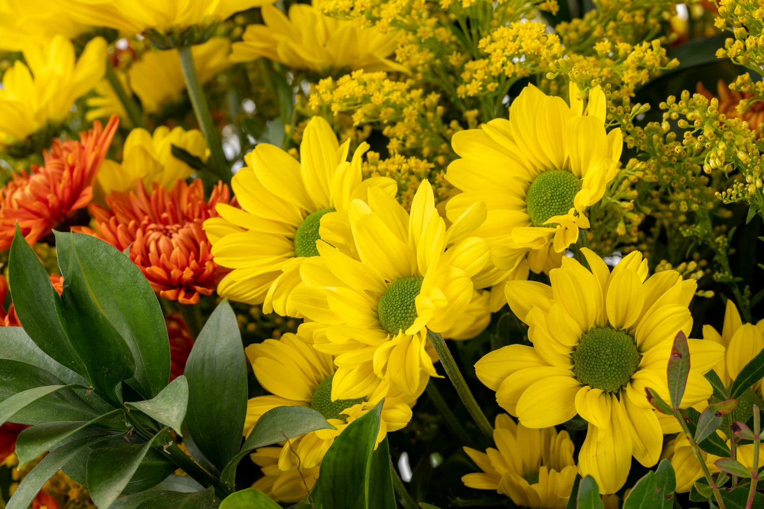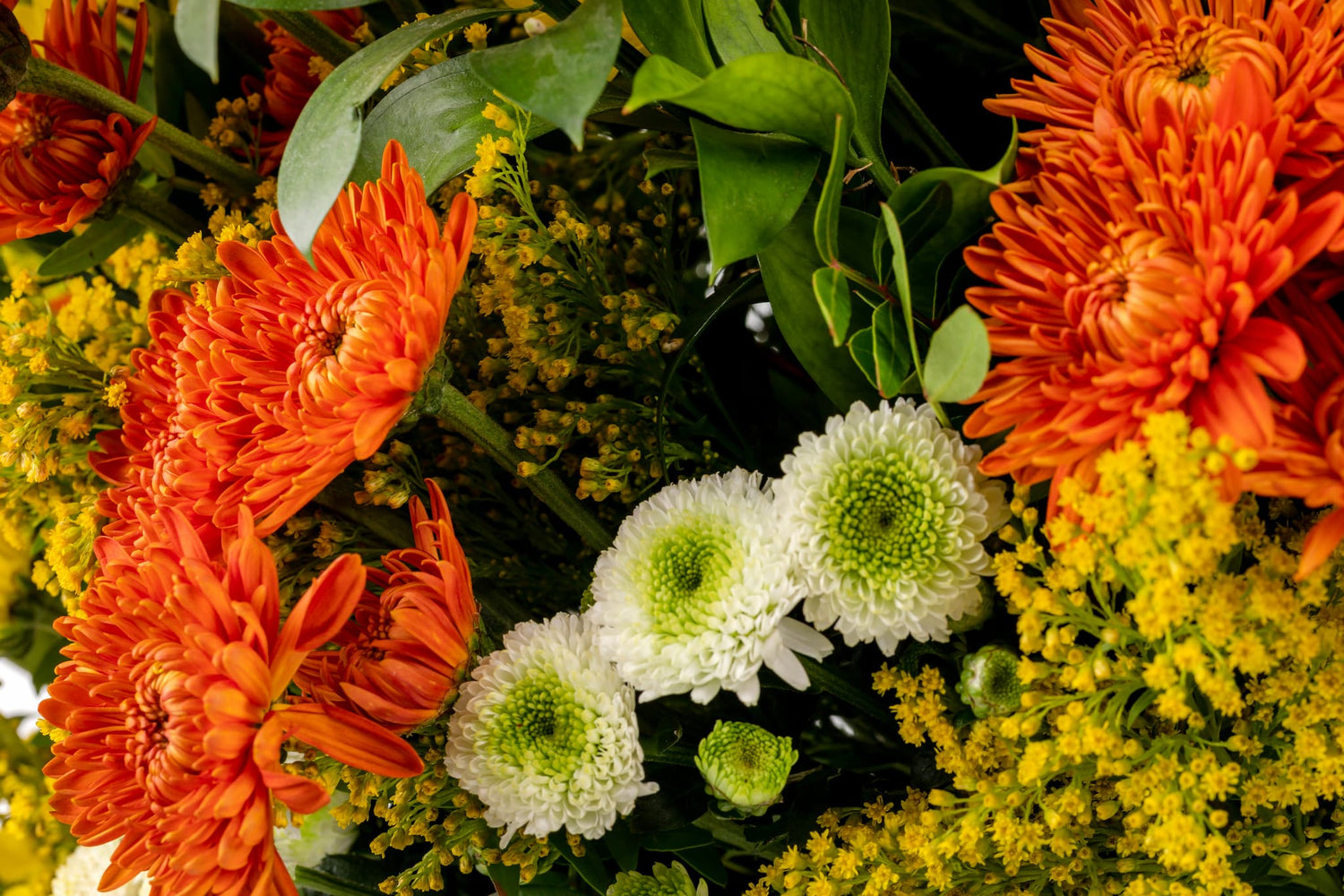 Este ramo presenta una paleta de colores vivos, con predominancia de amarillos, naranjas y blancos, evocando la frescura, compuesta por una mezcla de flores de temporada, incluyendo crisantemos amarillos, margaritas naranjas y pequeñas flores blancas, cada tallo ha sido seleccionado cuidadosamente para ofrecer una textura y apariencia únicas, complementada con un follaje verde exuberante que añade un toque de frescura y naturalidad.
