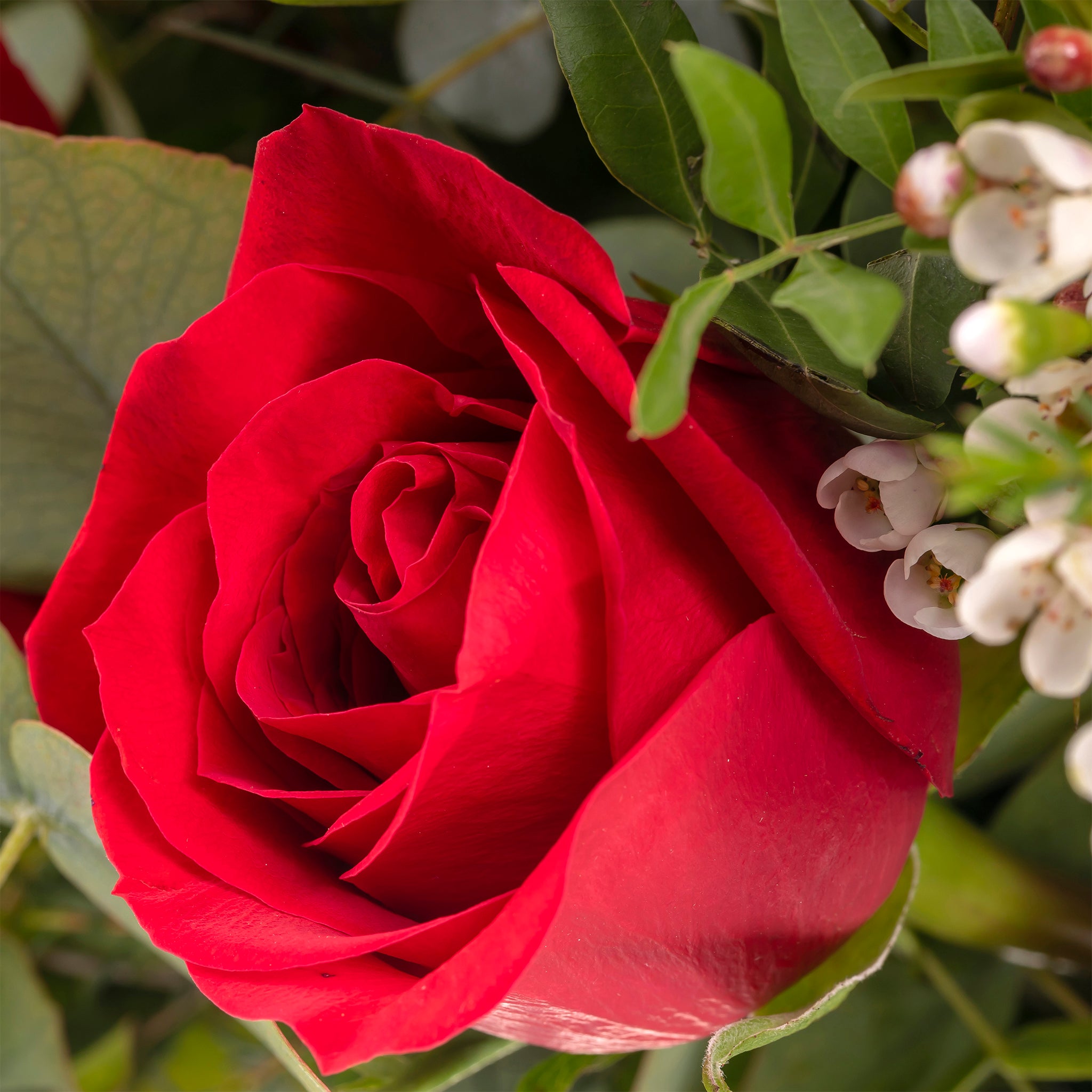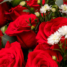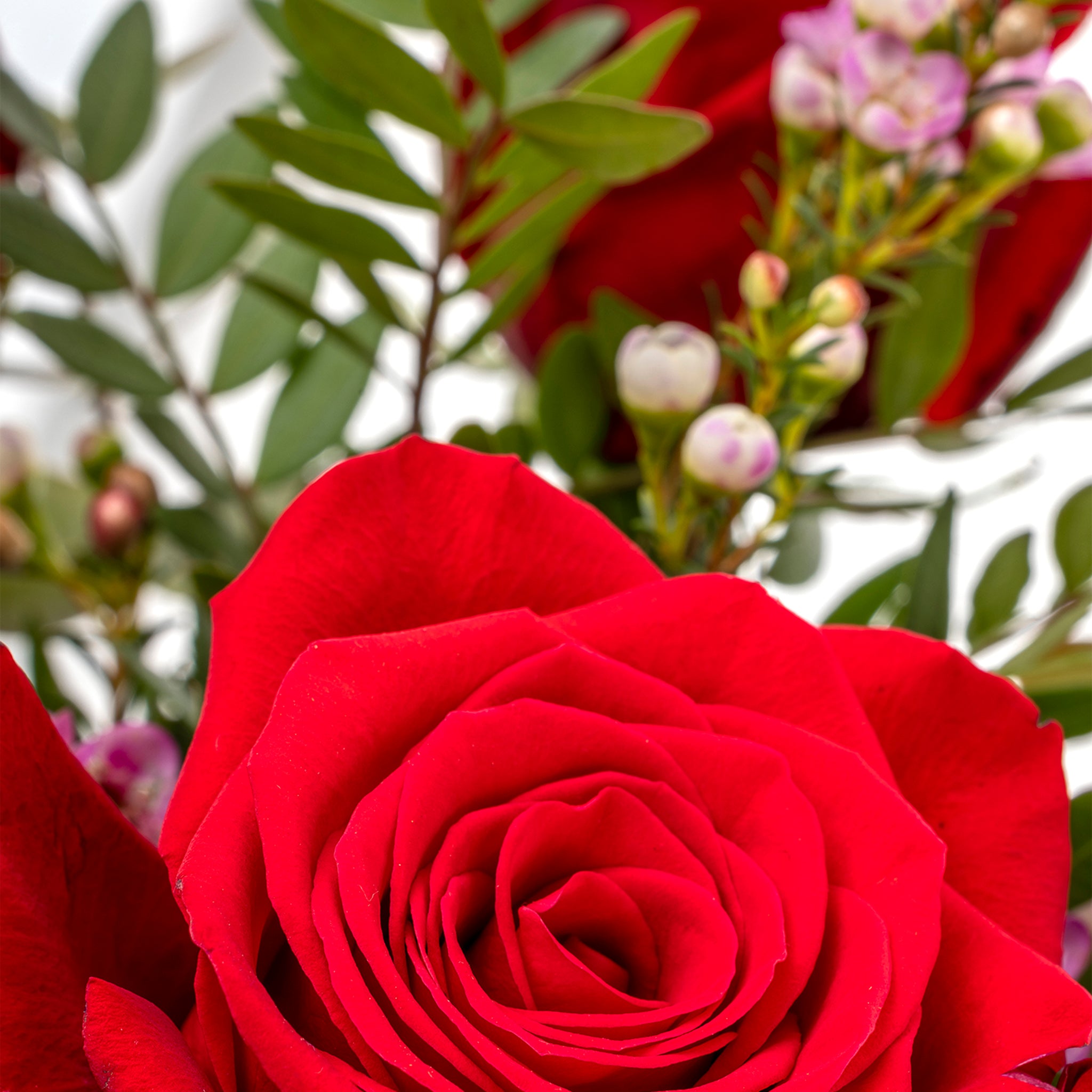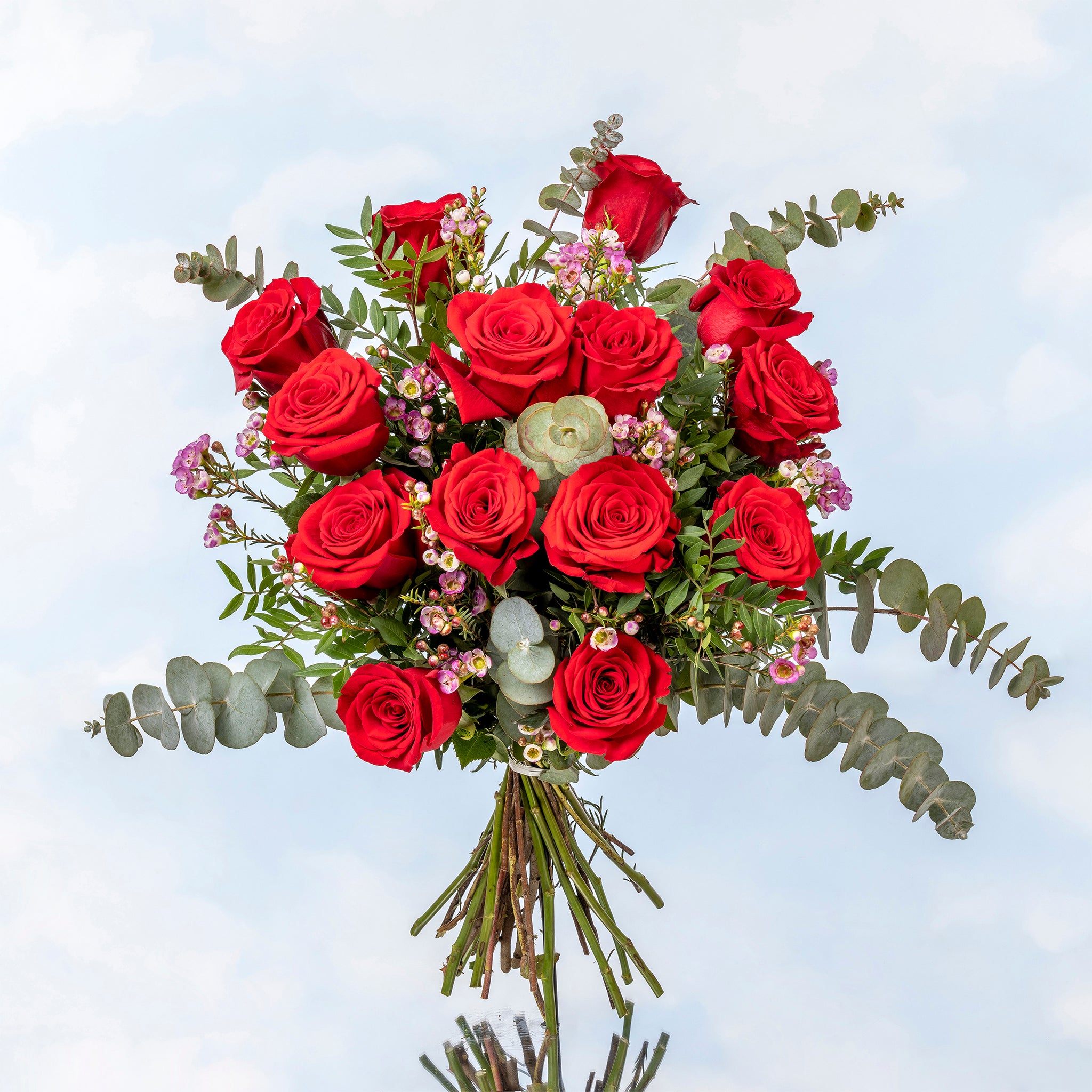 Las Rosas Rojas, símbolo del amor apasionado y la belleza eterna, se entrelazan con las ramas de Eucalipto, aportando un toque de frescura y vitalidad.