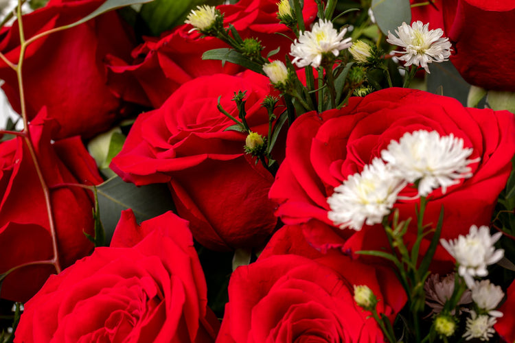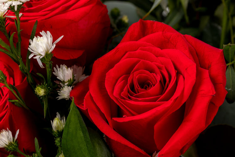 Símbolos eternos de amor y pasión, nuestras rosas rojas de alta calidad están seleccionadas meticulosamente para garantizar su frescura y belleza, pequeñas flores blancas se entremezclan con las rosas, agregando un contraste delicado que resalta aún más la intensidad del rojo.