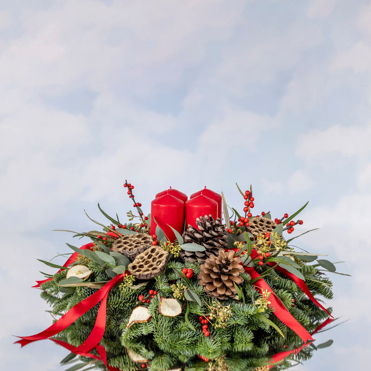 Elaborados con ramas frescas de abeto natural, frutos decorativos de temporada y una o varias velas rojas tradicionales, estos centros transforman cualquier mesa en un escenario navideño elegante y lleno de encanto.