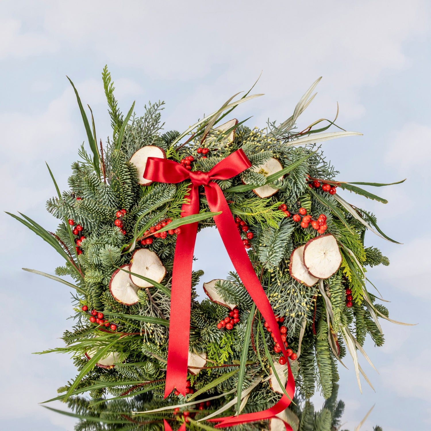La Corona de Navidad de Mon Parnasse es una pieza artesanal diseñada para llenar tu hogar de la esencia más auténtica y elegante de la temporada. Elaborada con ramas frescas de  abeto natural, está decorada con bayas rojas, rodajas de manzana o fruta deshidratada, eucalipto estacional y un lazo rojo de satén que aporta el toque clásico y festivo que caracteriza a la Navidad.