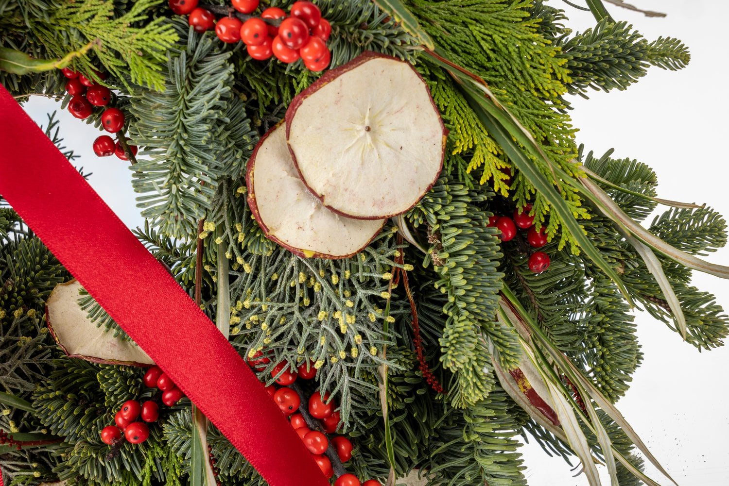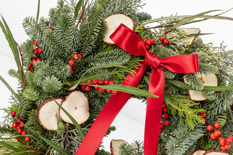 Corona de Navidad natural decorada con abeto, bayas y lazo rojo | Mon Parnasse